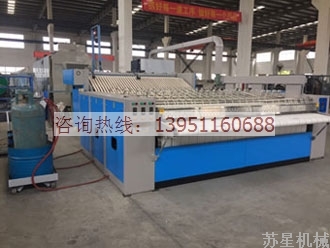 蘇星燃?xì)猓ㄌ烊粴?,液化石油氣)直燃式?jié)能環(huán)保型燙平機(jī),無須鍋爐,耗能量是通用燙平機(jī)的三分之一。當(dāng)布草含水率≤61%,熨燙速度為25-30米時(shí),三滾燃?xì)庀牧績(jī)H4.62Kg/h,平均到每滾只有1.54Kg/h.